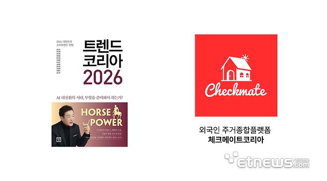 외국인 주거종합플랫폼 '체크메이트코리아'가 국내 최대 트렌드 전망서 트렌드코리아 2026에 소개되며 관심을 모으고 있다. 트렌드코리아는 매년 10월 김난도 서울대 소비자학과 교수를 비롯한 전문가들이 발간하는 한국 대표 트렌드 분석서로, 이듬해 사회·산업 전반의 흐름을 진단하고 전망하는 책이다. 이번 트렌드코리아 2026에서 제시된 10대 키워드는 △휴먼인더루프 △필코노미 △제로클릭 △레디코어 △AX조직 △픽셀라이프 △프라이스 디코딩 △건강지능(HQ) △1.5가구 △근본이즘이다.