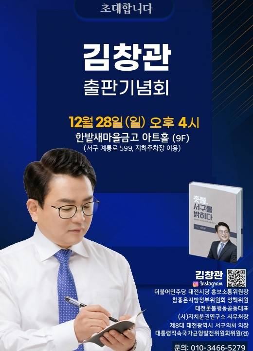 김창관 전 대전서구의회 의장이 집필한 신간 '촛불, 서구를 밝히다'의 출판기념회가 오는 12월 28일(토) 오후 4시, 한밭새마을금고 아트홀(9층)에서 열린다.