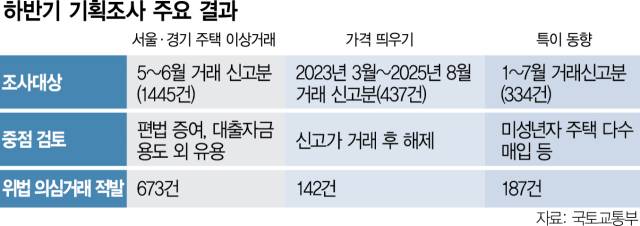 미성년자의 주택 다수 매입 등 특이 동향에 대한 기획 조사에서는 총 187건의 위법 의심 거래, 250건의 위법 의심 행위가 적발됐다. 특이 동향 기획조사는 부산·대전 등 위법행위 발생 우려 지역을 대상으로 광범위하게 이뤄졌다. 의심 행위로는 △편법 증여 △거래금액 거짓 신고 △전세사기 의심 사례가 주를 이뤘다.