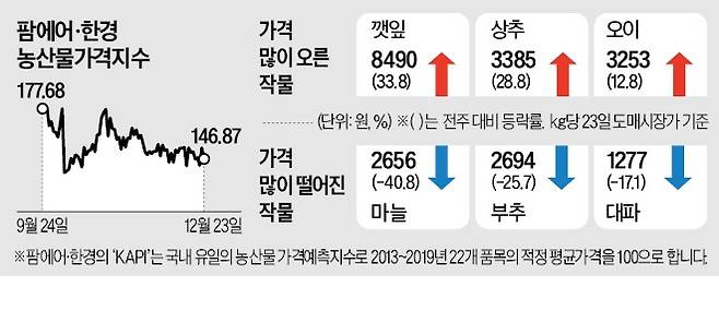 22개 주요 농산물 가격을 기반으로 하는 KAPI는 지난 23일 전일 대비 4.2% 하락한 146.87을 기록했다.