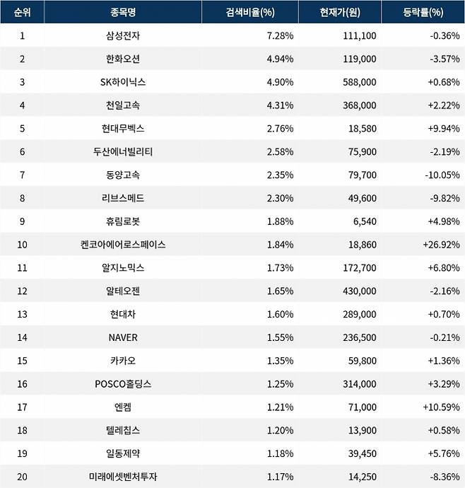 이어 검색비율 2위의 한화오션(042660)은 하락률 3.57%로 하락 마감했다. 검색비율 3위의 SK하이닉스(000660)는 0.68% 상승 마감했다. 검색비율 4위 천일고속(000650)은 2.22% 상승 마감했다. 검색비율 5위 현대무벡스(319400)는 9.94% 상승하며 상승 마감했다.