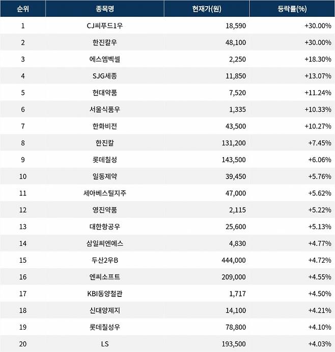 [서울데이터랩]CJ씨푸드1우 30.00% 상한가 금일 증시 상승률 1위로 마감