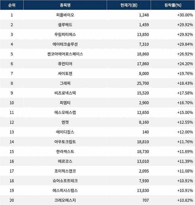 6위 퓨런티어(370090)는 17,860원으로 24.20% 급등 마감했다. 7위 싸이토젠(217330)은 종가 8,000원으로 19.76% 급등 마감했다. 8위 그래피(318060)는 종가 25,700원으로 18.43% 급등 마감했다. 9위 비츠로넥스텍(488900)은 15,520원으로 17.58% 급등 마감했다. 10위 피엠티(147760)는 2,900원으로 16.70% 급등 마감했다.