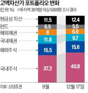 24일 한국경제신문이 삼성증권에 의뢰해 투자금액이 30억원 이상인 자산가 5500여 명의 포트폴리오를 분석한 결과 지난 9월부터 이달 17일까지 비중이 가장 많이 커진 자산은 국내 주식이었다. 이 기간 국내 주식 비중은 37.2%에서 40.8%로 3.6%포인트 증가했다. 해외 주식은 같은 기간 15.5%에서 15.6%로 0.1%포인트 늘어나는 데 그쳤다.