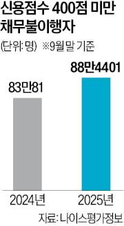 유영하 국민의힘 의원이 24일 나이스평가정보에서 받은 ‘신용점수별 가계대출 현황’ 자료에 따르면 신용점수 400점 미만 차주 가운데 금융채무 불이행자는 올해 9월 말 88만4401명이었다. 작년 9월 말(83만81명) 대비 1년 새 5만4320명(6.5%) 늘었다. 2023년 말(78만7709명)과 비교하면 1년9개월 만에 9만6692명(12.3%) 급증했다.