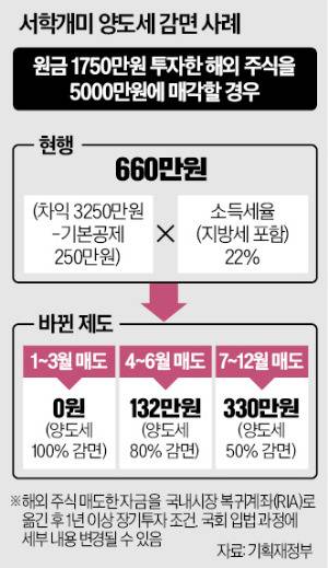 몇 년 전 1750만원에 매수한 미국 주식이 5000만원까지 오르자 서학개미 A씨는 차익 실현 시점을 고민하기 시작했다. 현재는 차익 3250만원의 22%(지방세 포함)인 660만원을 양도소득세로 내야 한다. 반면 내년 1분기 안에 ‘국내 시장 복귀계좌’(RIA)를 통해 해외 주식을 매각한 다음 원화로 환전해 국내 주식에 장기투자하면 세금을 한 푼도 내지 않아도 된다.