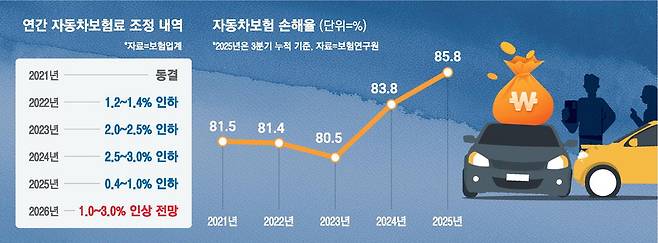 차보험료는 2021년 동결 후 2022~2025년 4년간 내려가기만 했다. 여기에 각종 정비 관련 비용 인상과 기상 악화라는 악재까지 겹치면서 2023년까지 플러스였던 자동차보험 손익은 작년 97억원 적자로 돌아섰고, 올해는 7035억원의 손실이 예상된다. 상생금융 기조를 견지하면서 물가 상승 우려로 보험료 인상에 강하게 반대해왔던 금융당국이 내년 차보험료 인상에 크게 반대하지 않는 이유다.