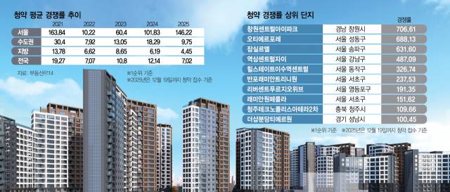 반면 서울 청약 경쟁률은 지난해 101.83대 1에서 올해 146.22대 1로 더 높아졌다. 2021년 164.13대 1 이후 가장 높은 수준이다. 올해 전국에서 100대 1 이상의 청약 경쟁률을 기록한 단지 10개 중 7개를 서울 아파트 단지가 차지할 정도다. 경남 창원시 창원센트럴아이파크가 706.61대 1로 가장 높은 경쟁률을 기록한 가운데 서울의 성동구 오티에르포레(688.13대 1), 송파구 잠실르엘(631.6대 1), 강남구 역삼센트럴자이(487.09대 1), 동작구 힐스테이트이수역센트럴(326.74대 1), 서초구 반포래미안트리니원(237.53대 1), 영등포구 리버센트푸르지오위브(191.35대 1) 등이 100대 1 이상의 청약 경쟁률을 기록했다.