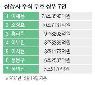 홍라희 리움미술관 명예관장이 9조8202억원으로 3위, 이부진 호텔신라 사장이 8조8389억원으로 4위, 이서현 삼성물산 사장이 8조1173억원으로 5위를 기록하며 뒤를 이었다.