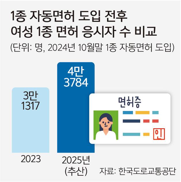23일 한국도로교통단의 ‘제1종 보통 자동변속기 조건부 면허 도입 후 효과분석 연구’ 보고서(연구기관 한국아이티에스학회)에 따르면 올해 1∼8월 여성 1종 면허 응시자는 2만9189명(수동 7681명·자동 2만1508명), 2종 면허는 19만5151명(수동 2929명·자동 19만2222명)으로 집계됐다. 이 비율이 유지된다고 가정할 때 올해 전체 여성 1종 면허 응시자는 4만3784명(수동 1만1522명·자동 3만2262명)으로 추산됐다. 1종 자동면허 도입 전인 2023년(3만1317명)과 비교해 39.8% 늘었단 것이다. 같은 기간 남성 1종 면허 응시자 수(24만2756명→26만2145명)는 8% 늘었을 뿐이다.
