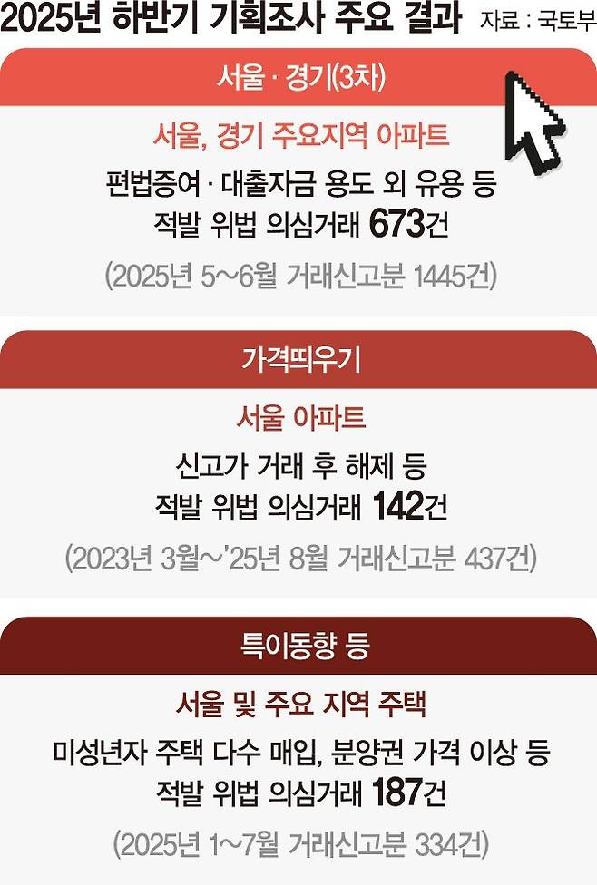 이번 기획조사는 △서울·경기 주택 이상거래 △부동산 실거래가 띄우기 △특이동향 등 3개 분야를 대상으로 진행됐다. 서울·경기 주택 이상거래 조사는 2025년 5~6월 거래신고분을 대상으로 실시됐으며 총 1445건을 분석한 결과 위법 의심거래 673건, 위법 의심행위 796건이 적발됐다. 지역별로는 서울 572건, 경기 101건이다.