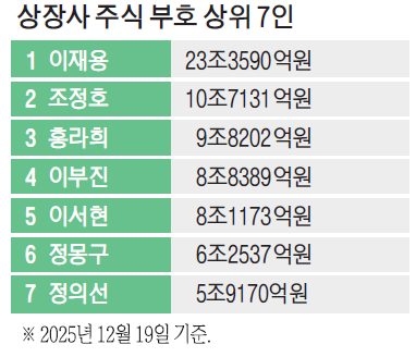 홍 명예관장이 9조8202억원으로 3위, 이부진 호텔신라 사장이 8조8389억원으로 4위, 이서현 삼성물산 사장이 8조1173억원으로 5위를 기록하며 뒤를 이었다. 상위 10위권에는 정몽구 현대자동차그룹 명예회장(6조2537억원), 정의선 현대차그룹 회장(5조9170억원), 박순재 알테오젠 대표(4조5723억원), 정몽준 아산정책연구원 명예이사장(4조1771억원), 방시혁 하이브 의장(4조1230억원)이 포함됐다.