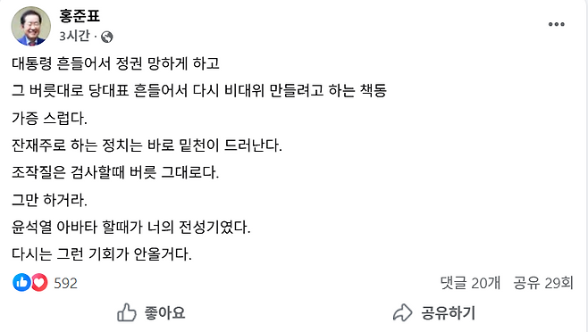홍 전 시장이 24일 밤 자신의 SNS 계정에 "대통령 흔들어서 정권 망하게 하고, 그 버릇대로 당 대표 흔들어서 다시 비대위 만들려고 하는 책동 가증스럽다"고 썼다.