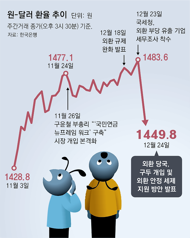 다만 장기적으로는 한국 투자의 매력을 높일 수 있는 근본적인 정책이 필요하다는 의견도 제시됐다. 한시적 인센티브가 끝나면 다시 달러 수요가 튀어오를 것이란 전망이다. 이날 원-달러 환율이 급락하자 ‘저가 매수’ 기회로 보고 환전 수요가 몰려 일부 시중은행 지점에서 100달러짜리 지폐가 소진되기도 했다. 하나은행 관계자는 “연말 해외여행을 앞둔 고객들의 달러 수요가 늘어난 데다 환율이 떨어졌을 때 미리 달러로 환전해 두려는 수요가 겹친 것 같다”며 “영업점별로 보유 한도가 정해져 있어 규모가 작은 영업점은 일시적으로 동나는 경우도 있다”고 했다.