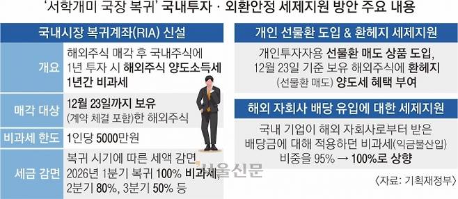 기획재정부는 이날 이런 내용의 ‘국내 투자·외환 안정 세제지원 방안’을 발표했다. 먼저 해외 증시 투자자를 대상으로 한 ‘국내시장 복귀계좌’(RIA)를 신설해 비과세 혜택을 주기로 했다. 지난 23일까지 해외 주식을 보유했던 개인투자자가 주식을 매각한 뒤 자금을 RIA로 옮겨 국내 주식에 1년 이상 장기 투자하면 해외 주식 양도세를 1년간 면제한다. 현재 세무당국은 해외 주식 양도 차익에 대해 250만원을 기본 공제한 뒤 양도세율 20%와 지방세율 2%를 더한 총 22%의 세율을 매기고 있다.