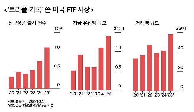 25일 블룸버그 인텔리전스에 따르면 올들어 지난 19일까지 미국 상장 ETF는 자금유입 규모, 신규상품 건수, 거래량이 각각 모두 역대 최고치를 경신했다. 세 지표가 한 해에 동시에 사상 최고를 기록한 것은 코로나19 영향으로 글로벌 유동성이 급증해 ‘투자 붐’이 불었던 2021년 이후 처음이다.