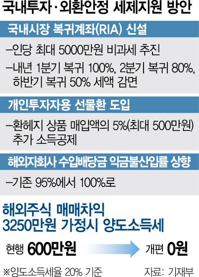 정부가 내년부터 해외 주식을 팔고 국내 주식에 1년 이상 장기 투자하는 ‘서학개미’에게 양도소득세를 한시적으로 면제해준다. 우리 기업이 해외 자회사로부터 받는 배당금에 대해서는 전액 비과세 혜택을 적용하기로 했다. 서학개미와 수출 기업에 대한 세제 혜택을 통해 해외에 묶인 달러 자금을 국내로 유입시켜 고공 행진하는 원·달러 환율을 잡겠다는 전략이다.