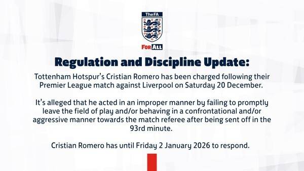 FA의 공식 대변인 채널인 'FA Spokesperson'는 25일 "토트넘 홋스퍼의 크리스티안 로메로는 지난 12월 20일(현지시간) 리버풀과의 프리미어리그 경기 이후 기소됐다"며 "그는 93분 퇴장 판정 이후 경기장을 즉시 떠나지 않았거나, 주심을 향해 대립적이거나 공격적인 태도를 보였다는 혐의를 받고 있다"고 밝혔다. 이어 "로메로는 2026년 1월 2일 금요일까지 이에 대한 소명을 제출해야 한다"고 덧붙였다.