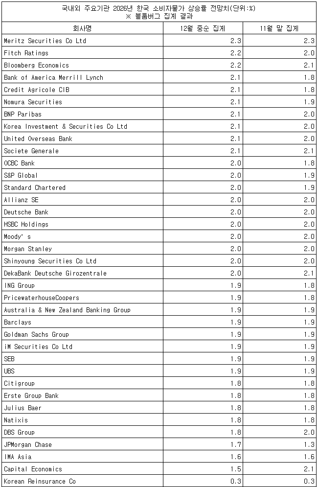 25일 블룸버그 집계 결과에 따르면, 이달 중순 주요 기관 37곳이 제시한 내년 한국의 소비자물가 상승률 전망치 중간값은 2.0%로 집계됐다.