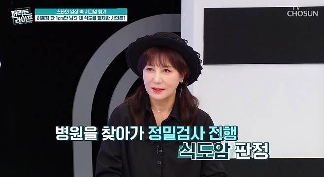 허윤정은 식도암 전조증상에 대해 묻자 "처음에는 음식 먹으면 내려가다가 목 오른쪽이 따끔한 느낌이 있었다. 근데 며칠이 지나도 답답하고 따끔거려서 병원에 찾아가 정밀 검사를 받았는데 암으로 나왔다. 골든 타임은 놓쳐서 내시경 수술은 불가능하고 항암 치료 또는 식도 절제 수술을 해야 한다는 말에 하늘이 무너지는 것처럼 눈물이 났다"고 말했다.