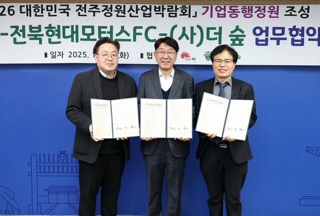 전북현대는 지난 23일 전주시청에서 전주시(시장 우범기), 사단법인 더숲(대표 정명운)과 함께 '2026 대한민국 전주정원산업박람회' 기업동행정원 조성을 위한 업무협약을 체결했다.