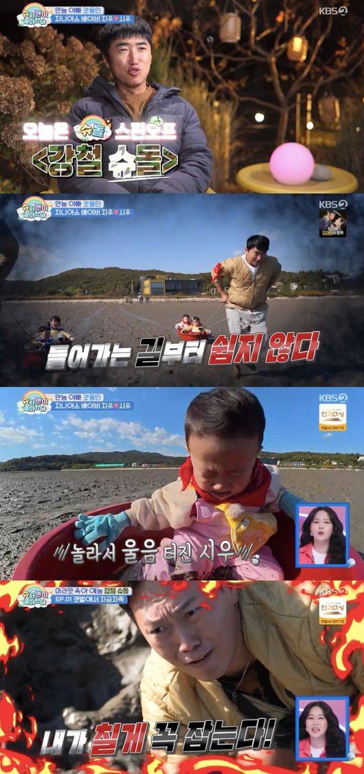 설상가상 갯골이 등장했는데. 송진우는 “이게 슈돌이라고?”라며 힘든 상황에 당황했고, 장동민은 “이건 강철 슈돌이다. 강철 슈돌 1기에 온 걸 환영한다”라고 너스레를 떨었다.