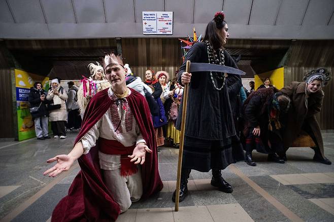 [키이우=AP/뉴시스] 24일(현지 시간) 우크라이나 키이우의 한 지하철역에서 시민들이 크리스마스이브를 맞아 크리스마스 상황극을 재현하고 있다. 우크라이나는 2023년 러시아와 문화·종교 분리를 위해 전통 크리스마스를 1월 7일에서 12월 25일로 공식 변경했다. 2025.12.25.