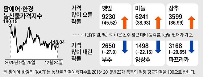 25일 팜에어·한경 농산물가격지수(KAPI)를 산출하는 가격 예측 시스템 테란에 따르면 지난 24일 기준으로 깻잎은 도매시장에서 평균 9230원에 낙찰됐다. 공급은 줄어들지만 연말연시 회식 증가 등으로 수요가 늘어난 영향이다.