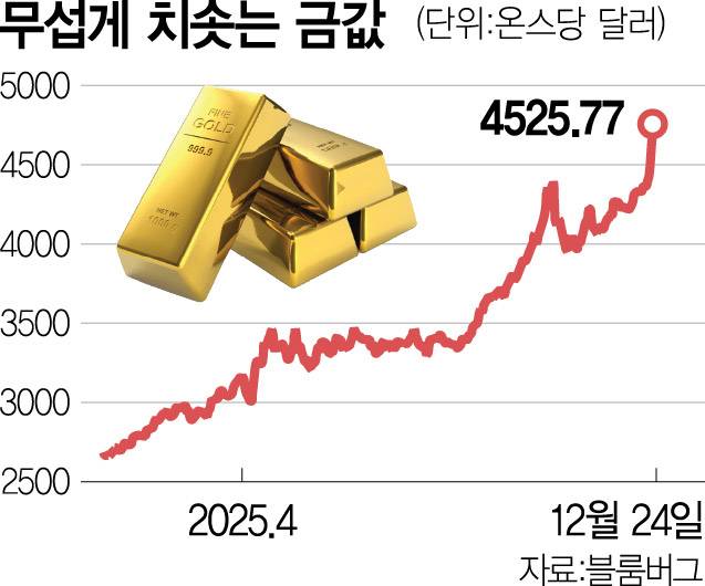 베네수엘라 사태로 요동치는 자산은 석유뿐이 아니다. 지정학적 불확실성이 확대되자 안전자산인 금과 은의 가격도 천정부지로 오르고 있다. 22일에는 금 가격이 트로이온스당 4400달러를 넘어서며 10월에 기록한 역대 최고치 4381달러를 경신했다. 은 현물 가격도 같은 날 트로이온스당 69달러 위로 치솟아 이전 최고치를 갈아치웠다. 금 현물·선물 가격은 23일에도 트로이온스당 4500달러까지 뛰어올라 최고치를 재경신했다. 은 현물 가격도 23일 트로이온스당 72달러를 돌파했다.