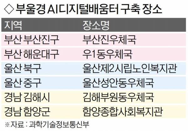 국민의 AI 기본역량을 높이는 거점 역할을 할 AI디지털배움터에 부산 부산진우체국(부산진구), 우1동우체국(해운대구)이 선정됐다. 울산에서는 울산 제2시립노인복지관(북구)과 성안동우체국(중구), 경남에서는 김해부원동우체국, 함양종합사회복지관이 지정됐다.