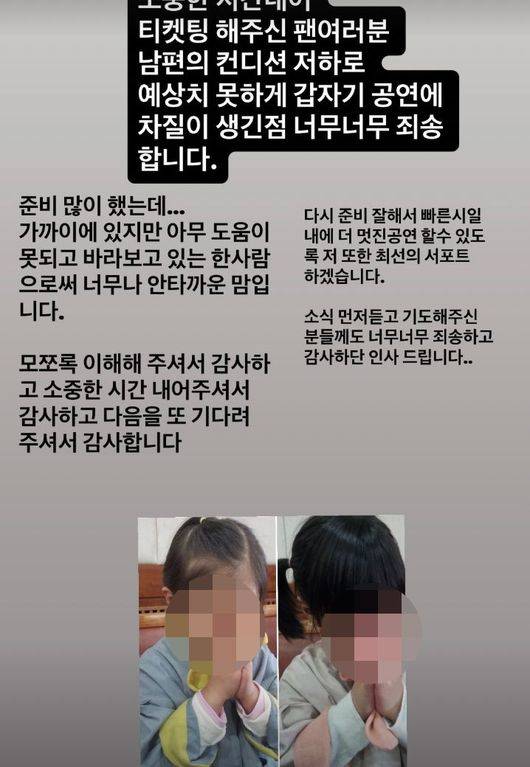 전미라는 25일 자신의 SNS 스토리를 통해 "소중한 시간 내어 티켓팅해주신 팬 여러분, 남편의 컨디션 저하로 예상치 못하게 공연에 차질이 생긴 점 너무 죄송하다"고 고개를 숙였다.