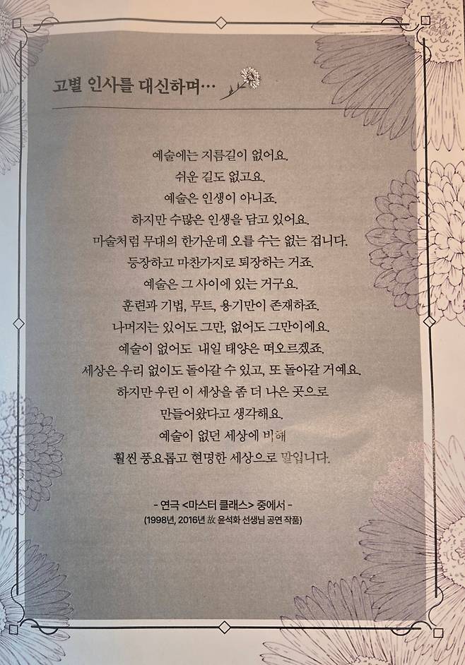 윤석화의 빈소엔 ‘당신을 잊지 않겠습니다’란 제목의 팸플릿이 놓여 있었고 거기 적힌 ‘고별 인사를 대신하며…’란 제목의 글은 ‘마스터 클래스’의 대사였다. “하지만 우린 이 세상을 좀 더 나은 곳으로 만들어 왔다고 생각해요. 예술이 없던 세상에 비해 훨씬 풍요롭고 현명한 세상으로 말입니다.” 헌화를 하고 묵념을 하는 동안 입술을 깨물며 숨죽여 말했다.