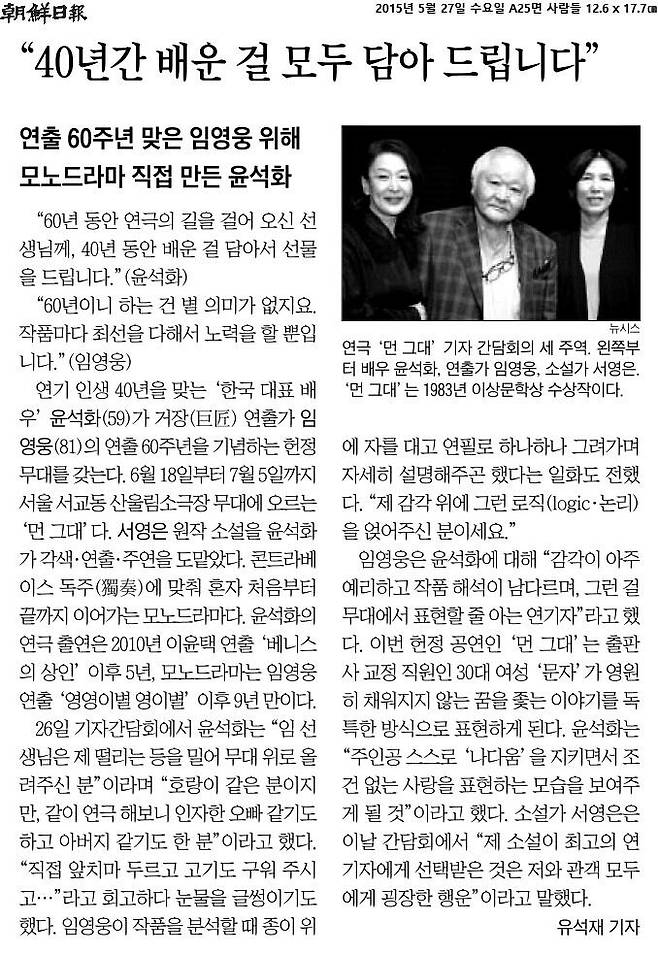 거장 연출가 임영웅의 연출 60주년을 기념해 본인이 직접 만든 모노드라마, 서교동 산울림소극장에서 공연한 ‘먼 그대’였다.