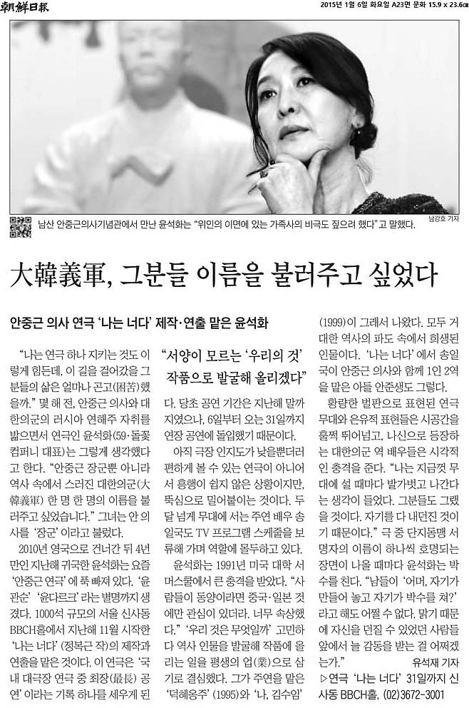 제작사 ‘돌꽃컴퍼니’의 대표로서 윤석화는 연극 연출도 맡았다. 안중근 의사가 주인공인 연극 ‘나는 너다’였다. 안중근과 아들 안준생의 1인 2역을 한 배우가 맡고 의병 역 배우들이 나신으로 등장하는 이 연극은 모호하고 혼미한 시공간을 관객이 알아서 헤매야 하는 ‘편하게 보기 힘든 연극’이었다. 2015년 1월 이 연극을 뮤지컬 전용 극장인 신사동 광림아트센터 BBCH홀에서 공연했다. 사실은 ‘탑 햇’이 예정돼 있었다가 취소된 빈자리를 연극으로 대신 때우는 모험을 했던 것이다.
