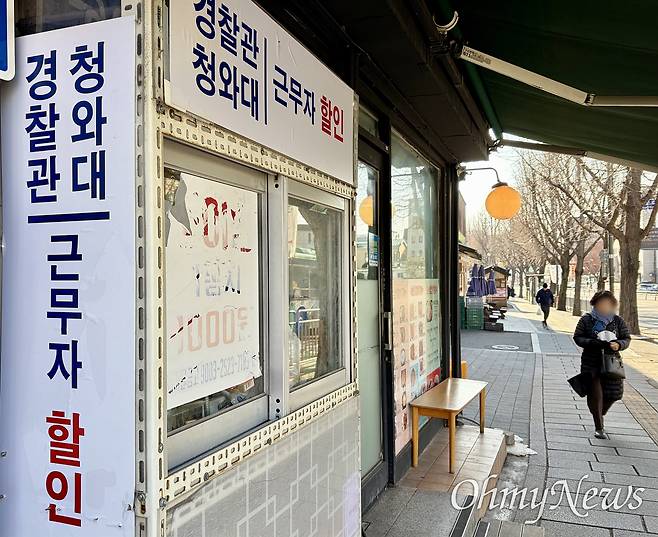 | ▲ 오는 29일 이재명 정부 대통령실이 청와대로의 이전을 완료하는 가운데 25일 오전 서울 종로구 청와대 인근에 위치한 한 식당에 "경찰관, 청와대 근무자 할인"을 알리는 간판이 설치돼 있다. |