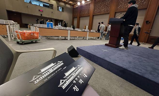 | ▲ 용산 대통령실 이전 작업을 본격화한 지난 21일 청와대 브리핑룸에서 기자와 직원들이 시설을 점검하고 있다. |