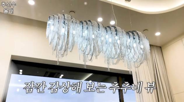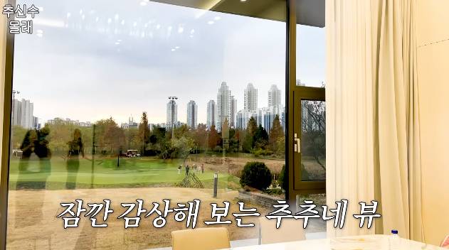 이어 "그 전에 살던 집 계약이 끝나서 새로운 집으로 이사한거다. 근데 공기 좋지 않냐"라고 말했고, PD는 "너무 좋다. 되게 조용하고"라고 감탄했다. 추신수도 "뷰가 좋다"라고 만족감을 드러냈다. 실제 커다란 통창뷰 너머로는 널찍한 골프장과 시티뷰가 별쳐져 있어 놀라움을 안겼다. 실내 역시 높은 층고와 커다란 샹들리에가 장식된 모습.