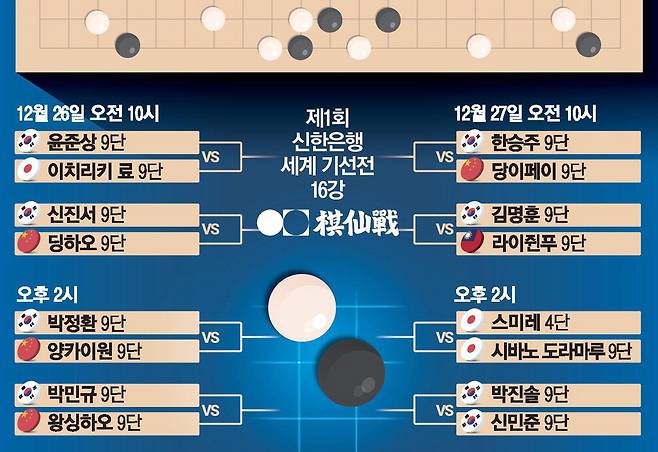 또 2024년 GS칼텍스배 프로기전 챔피언 신민준 9단은 같은 한국의 박진솔 9단과 8강 진출을 놓고 맞대결을 벌인다. 신한은행 세계 기선전은 16강전, 8강전까지 한국기원 바둑TV 스튜디오와 2층 특설 대국장에서 펼쳐지고 4강전은 서울 명동 로얄호텔에서 열린다. 결승전은 내년 2월 서울 신한은행 본점에서 3번기로 열릴 예정이다.