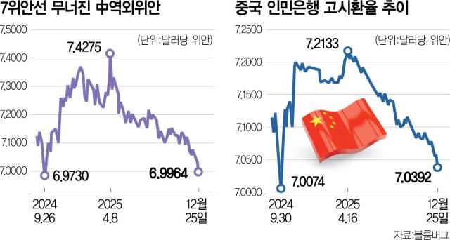 중국 역외 위안화 환율이 심리적 저지선으로 여겨지던 ‘포치(破七·달러당 7위안 초과)’ 상태를 해소하며 강세를 나타냈다. 미 연방준비제도(Fed·연준)의 금리 인하 기조 속에 중국 증시 반등을 노린 자금이 유입되고 인민은행이 위안화 강세를 용인한 데 따른 것이다.