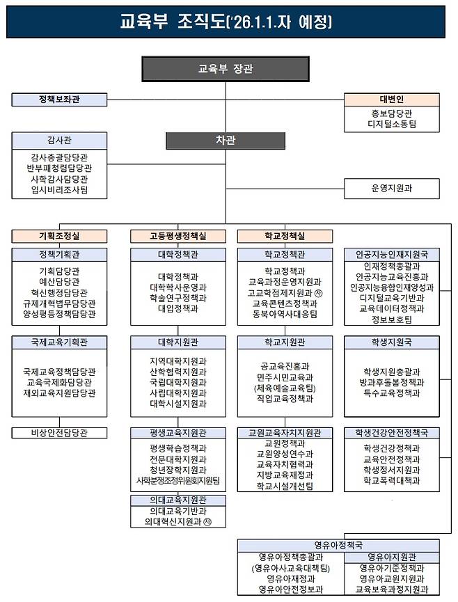| ▲ 교육부가 발표한 2026년 1월 1일자 적용 예정 교육부 조직 개편안. 인공지능인재지원국 신설 등 조직 구조 변화가 포함돼 있다. |
