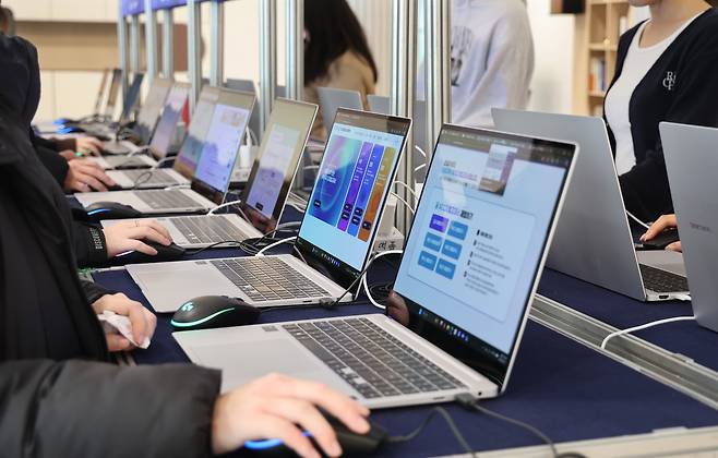 | ▲ 2월 21일 오전 부산 북구 SW·AI 교육거점센터에서 열린 'AI 디지털교과서 상설 전시회’에서 교원, 학생 등이 AI 디지털교과서를 살펴보고 있다. |