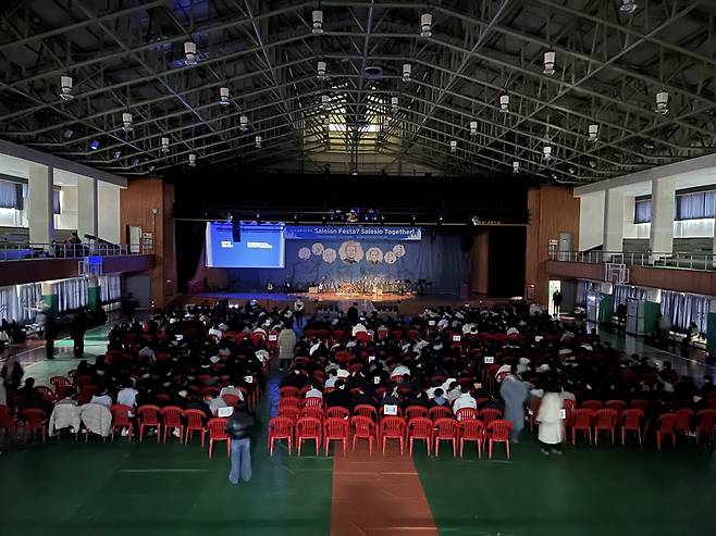 | ▲ 지난 23일에 열었던 학교 축제의 모습. 강당에 전교생이 모여 서로의 끼와 재능을 발산하는 모습을 통해 교육의 본령에 대해 생각해 볼 수 있었다. 행사를 주관한 학생자치회에서 사전에 자발적으로 스마트폰을 수거하였다. |