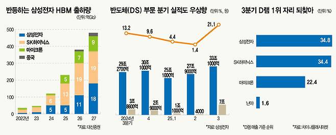 메모리 반도체 부문은 올해 초까지만 해도 위기 국면이었다. 시장에선 삼성전자 고대역폭메모리(HBM) 경쟁력을 의심했다. HBM 핵심 고객인 엔비디아향 HBM3E 품질 검증 승인이 늦어지면서다. 자연스레 HBM 주도권은 SK하이닉스로 넘어갔다.