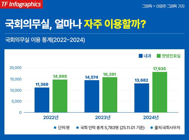 특히 본관 1층과 의원회관 2층에 있는 한방진료실을 찾는 국회 직원들의 발길이 잦다. 한방진료실은 이용 인원이 2022년 1만 4899명부터 2023년 1만 6291명, 2024년 1만 7935명까지 꾸준히 증가했다. 지난 11월 1일 기준 국회사무처를 통해 확보한 국회 인력 통계에 따르면 국회사무처(5023명), 국회도서관(413명), 국회예산정책처(176명), 국회입법조사처(171명) 종합하면 5783명이다.