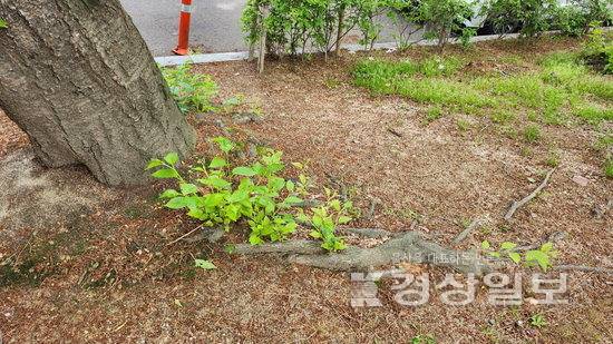 병영지구대를 앞에 둔 이곳은 도로에서 한 발만 올리면 바로 공원이다. 주변에 수령이 꽤 된 나무들이 늠름하고 듬직한 담이 돼 주고 있다. 잎이 무성한 느티나무 사이사이에 벚나무 은행나무 소나무가 간간이 보인다. 마치 느티나무 세상인 것 같은 이곳에서 생장력 좋은 벚나무가 눈에 띈다. 땅 위로 드러낸 뿌리가 줄기 되어 연둣빛 싹을 틔운다.