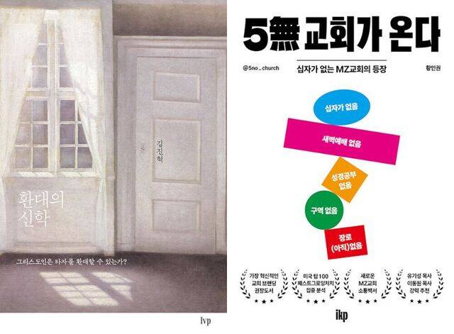 2025년 국민일보 올해 최고의 책엔 ‘환대의 신학’(IVP·왼쪽 사진)과 ‘5無 교회가 온다’(ikp·오른쪽)가 공동 선정됐다. 전자는 김진혁 횃불트리니티신학대학원대 교수가 기독교 고유의 가치인 ‘환대’를 신학과 인문학을 넘나들며 재해석한 실용적 신학서다. 브랜딩 전문가 황인권 인권앤파트너스 대표가 펴낸 후자는 서구권에서 성장하는 교회의 특징을 도출, 활용해 복음을 혁신적으로 전하는 방법을 안내한다.