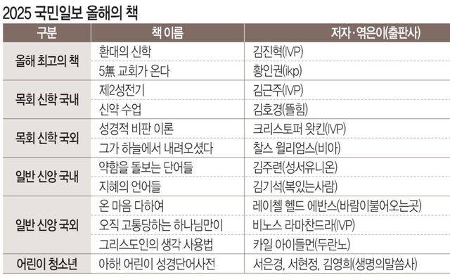 올해 최고의 책 저자와 ‘목회 신학 국내’ ‘일반 신앙 국내’ 분야 최다 추천작 저자는 대한예수교장로회 백석 총회(총회장 김동기 목사)와 기독교한국루터회(총회장 원종호 목사)가 후원한 소정의 상금이 수여된다. 시상식은 다음달 27일 서울 여의도 국민일보에서 열린다.