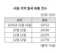 부동산 플랫폼 아실에 따르면 지난 23일 기준 서울 지역 월세 매물은 2만1779건으로 10월 16일 1만9712건 대비 10.5% 늘었다.