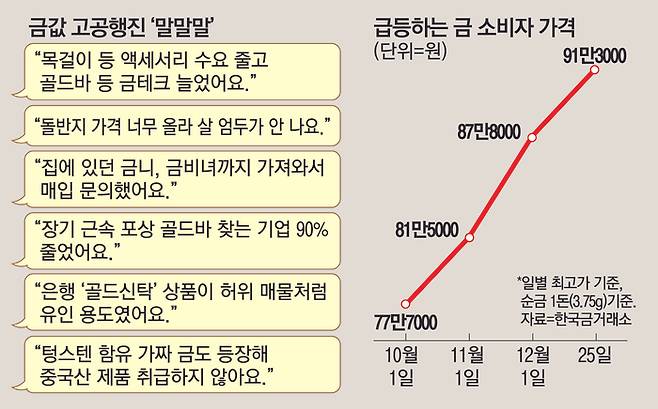 금값이 고공행진을 이어가고 있다. 한국금거래소에 따르면 순금 한 돈(3.75g)당 가격은 지난 10월 처음으로 90만원을 돌파했고, 이달 23일에 93만6000원으로 최고치를 기록했다.