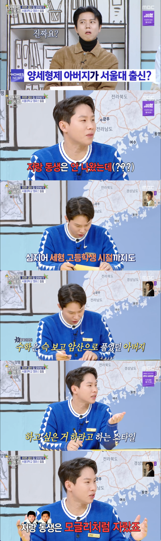 양세형은 “공부하라는 압박이 전혀 없었던 덕분에, 동생 세찬이와 나는 야생의 ‘모글리’처럼 산과 들을 누비며 자유분방하게 성장했다”고 덧붙여 폭소를 유발했다.